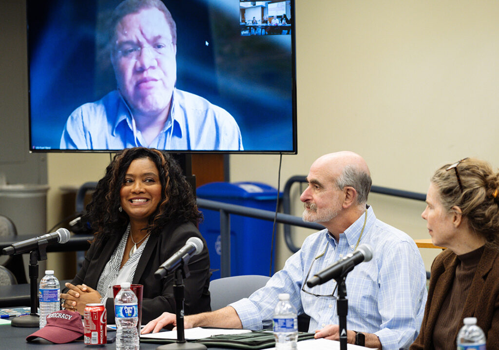 (L-R) Prof. Lisa Alexander is joined by David Abromowitz and Anne Jochnick, with Michael Neal on the screen above.